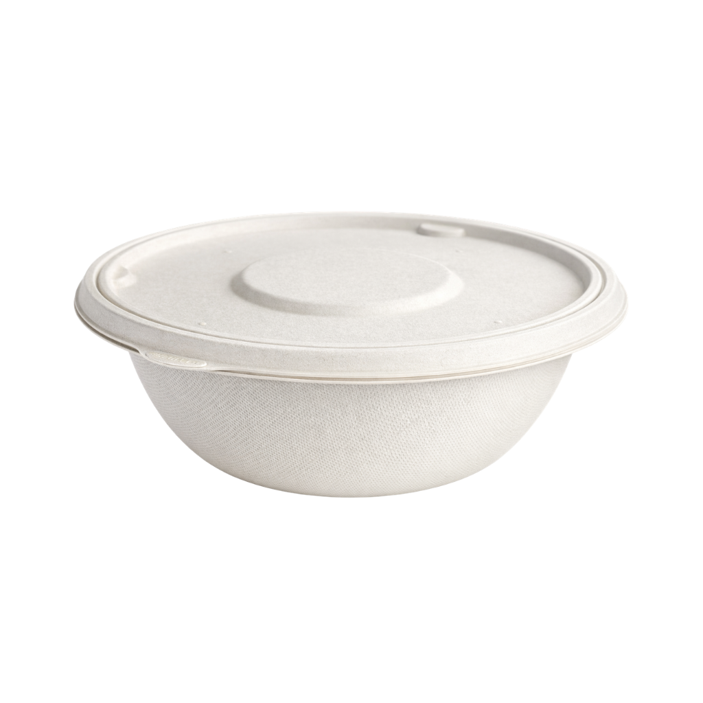Bowl compostable 1000 ml fabricado en bagazo de caña de azúcar con tapa de cierre hermético. Una solución práctica y sustentable para negocios gastronómicos que buscan reemplazar el plástico sin sacrificar resistencia ni presentación.